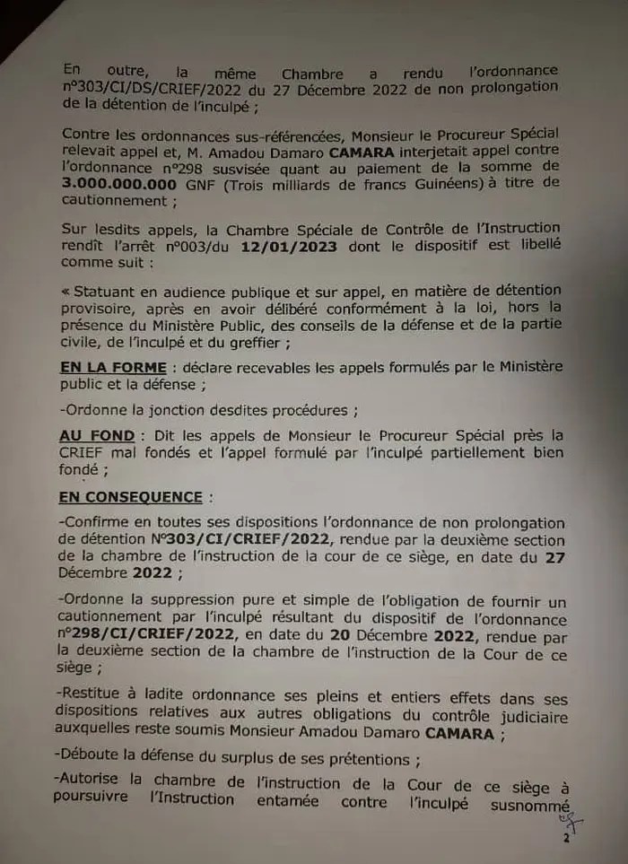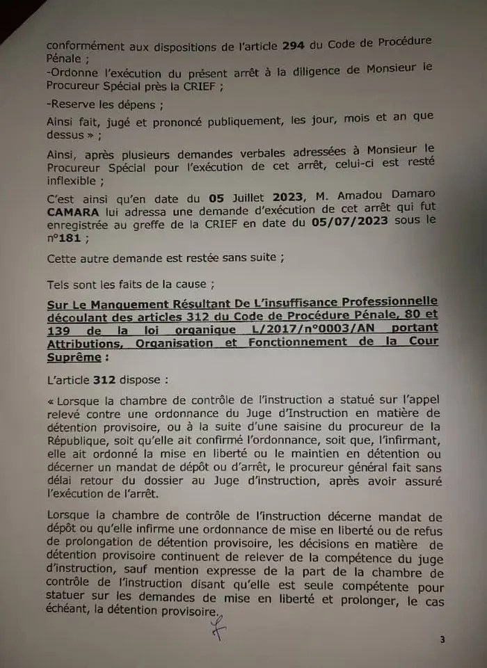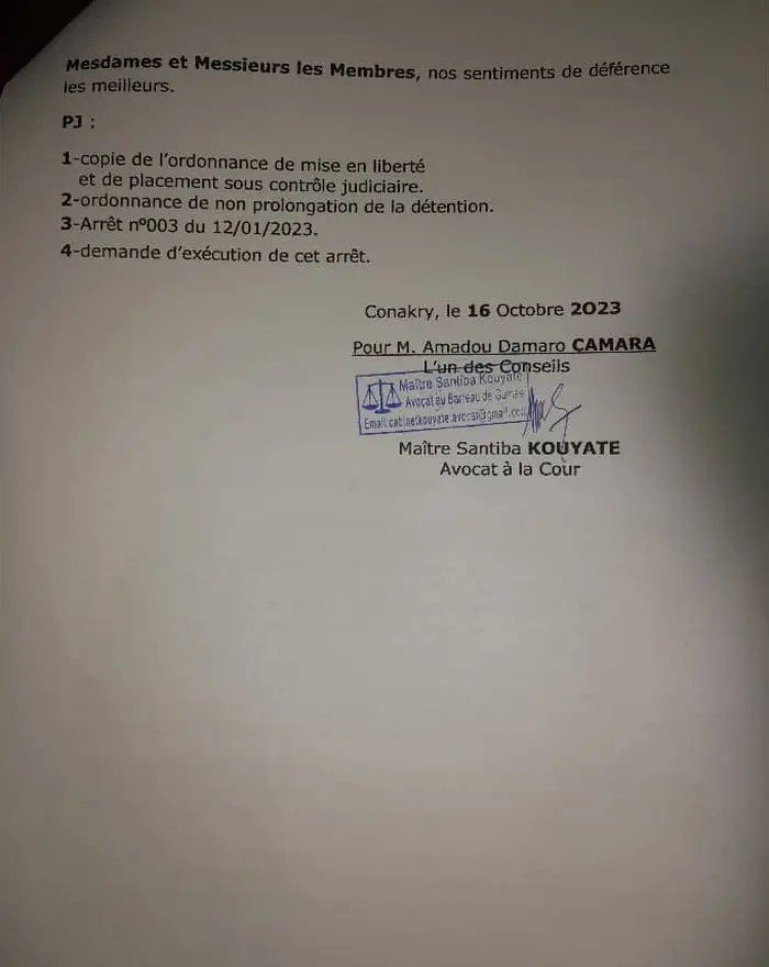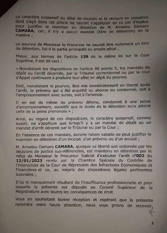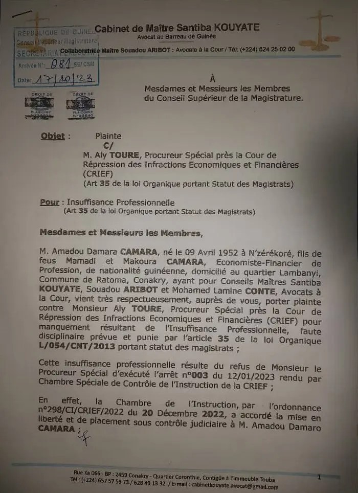 L’honorable Amadou Damaro Camaro a saisi le Conseil Supérieur de la Magistrature, par l’entremise de son avocat, maître Santiba Kouyaté. L’ex chef du parlement guinéen accusé le Procureur Spécial Aly Touré « d’insuffisance professionnelle« . La plainte a été formulée le lundi 16 octobre 2023 et adressée au Conseil Supérieur de la Magistrature.